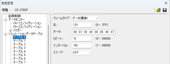 - 送信したいフレームや送信回数などをシミュレーションデータテーブルに登録します。