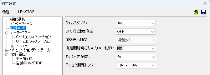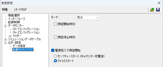- 「自動RUN/STOP」にて電源投入で測定開始 (クイックスタート)を設定します。