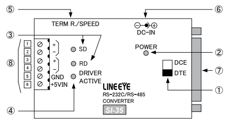 | ③ | データ状態表示LED | RS-422/485側データの送受信時に 点滅します。 SDはRS-232Cからの送信データで 点滅 RDはRS-422/485からの送信デー タで点滅 |