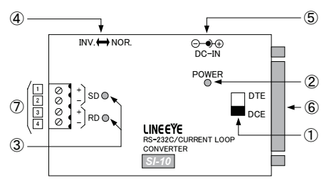 | ① | DTE/DCE切換スイッチ | 本機のRS-232Cコネクタの入出力を DTEまたはDCE仕様に切換えます。 |