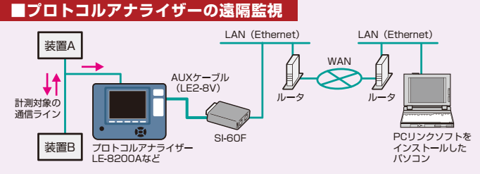 弊社のAUX(RS-232C)ポートがある旧プロトコルアナライザーをSI-60/SI-60F/SI-60F-LでLAN(イーサネット)に接続すれば、装置A-B間の通信データを連続測定しながら、その測定データを離れた事務所のパソコンでリアルタイムに解析できます。