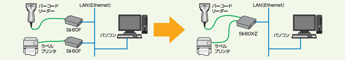 SI-60X2なら2台のRS-232C機器をまとめてLANに接続可能。当社のSI-60F/60 2台から置き換えれば、さらに低コスト化、省スペース化、省電力化が可能です。