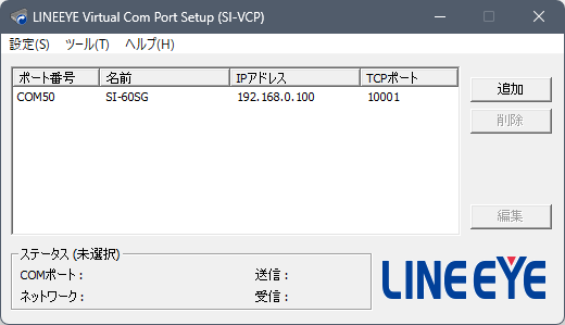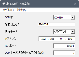SI-VCPで以下のようにCOM50に仮想COMポートを作成して、LA-SG100Eの「シリアル通信ポート番号」で設定したTCPポートにクライアントとして接続するように設定します。