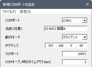 設定後にCOMポートに対応した機器が分かりやすいように、名前の項目に「SI-60SG」と入力しています。
