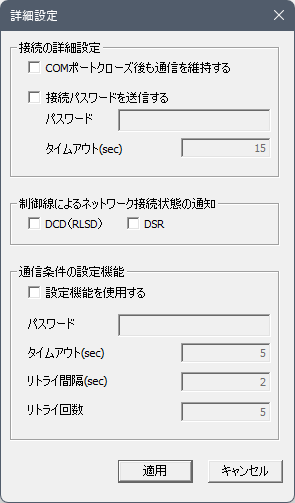 「新規COMポートの追加」または「COMxの編集」画面のメニューから、 [設定] -> [詳細設定] をクリックすると、「詳細設定」画面が表示されます。