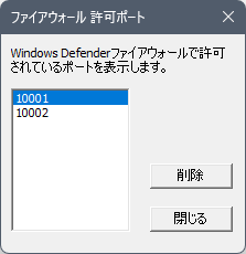 - 一覧:Windowsファイアウォールで許可されているポートの一覧を表示します。 詳しくは、ファイアウォール許可ポート一覧を参照してください。