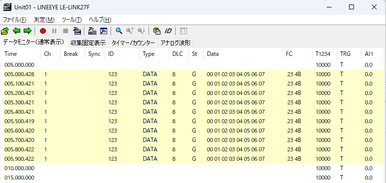 電源が投入されると、起動処理の後 すぐに測定が開始されます。バス上に何もデータが流れていなくても 上記の例では5秒後に外部入力補完でアナログ測定が行われ、測定値に依らずトリガー0が動作して テーブル0に登録したフレームが指定回数送信されます。