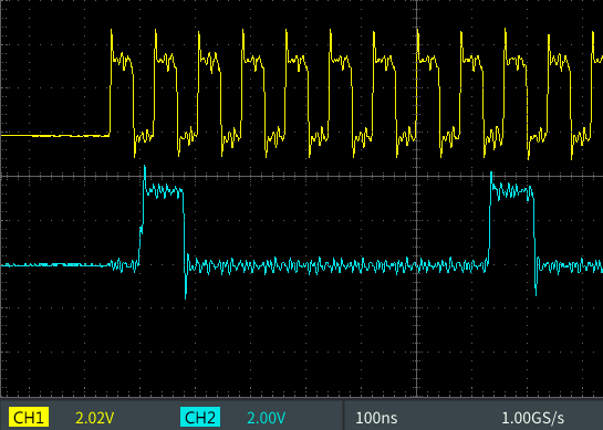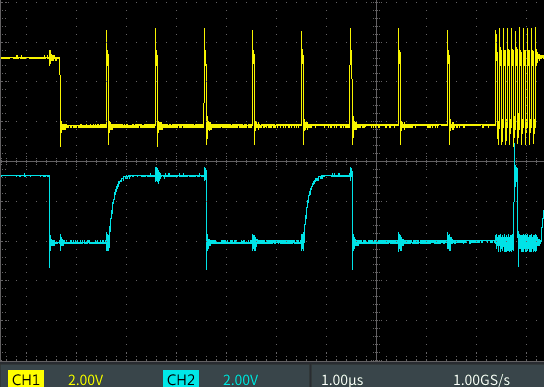 アドレス部のSDAはオープンドレイン動作。 バス上のI2Cデバイスが誤作動しないよう クロック幅は40ns 程度に短くされている。 |